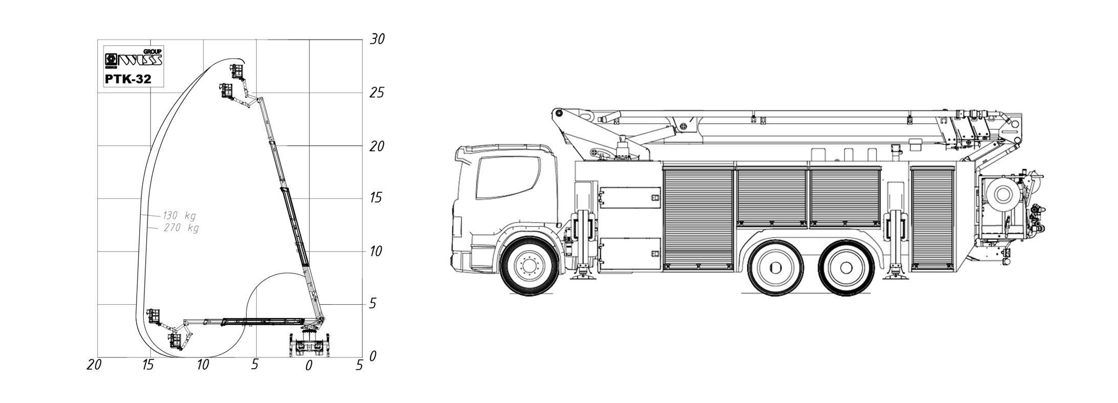 Czterosekcyjny wysięgnik z dodatkowym wysięgnikiem manewrowym osiąga wysokość roboczą do 32 metrów oraz zasięg poziomy do 15 metrów. Aluminiowy kosz ratowniczy o udźwigu 270 kg (2 osoby + 90 kg sprzętu) umożliwia działania na wysokości do 30 metrów. Konstrukcja systemu pozwala na precyzyjne pozycjonowanie w trudno dostępnych miejscach, co znacząco ułatwia prowadzenie akcji ratowniczych.
