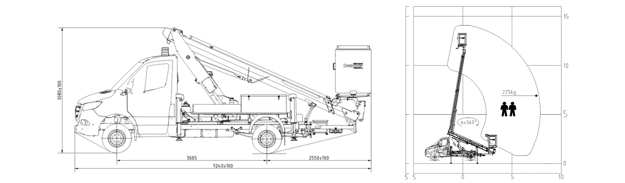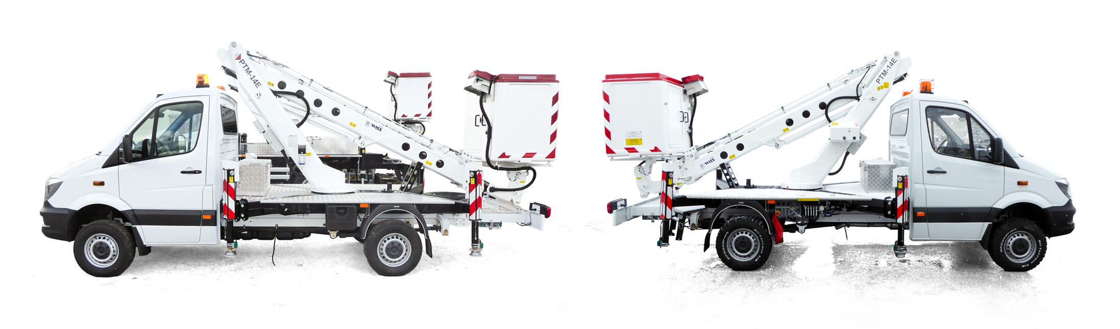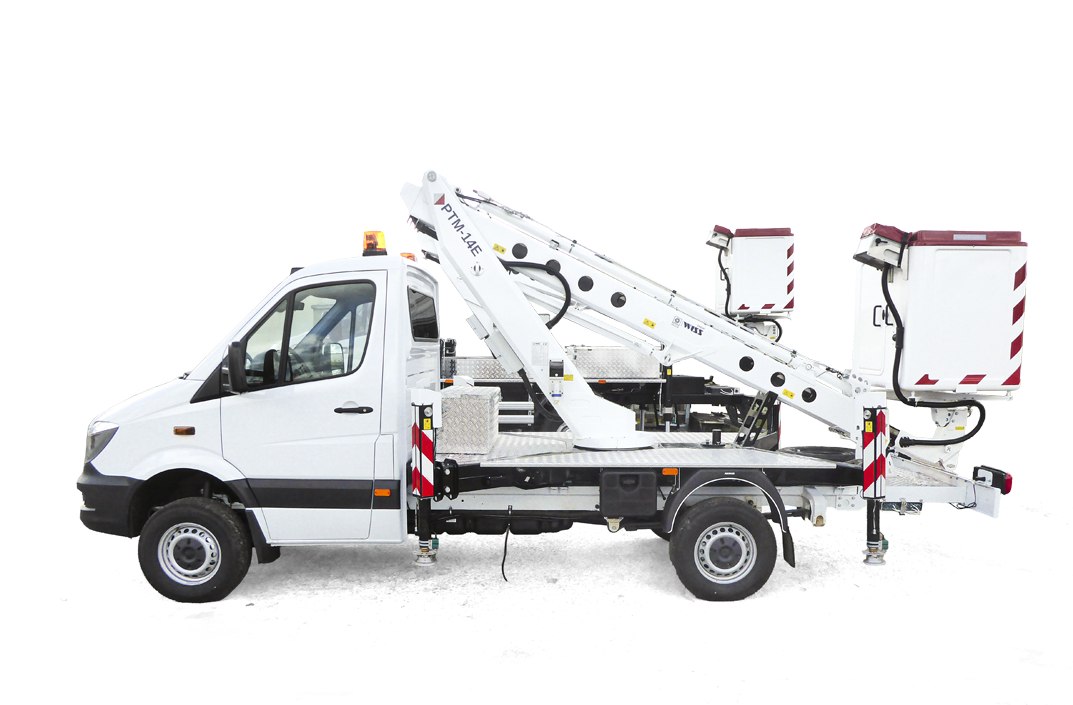 Mercedes Sprinter 314 CDI z silnikiem 150 KM i manualną lub automatyczną skrzynią biegów zapewnia niezawodność w różnych warunkach pracy. Napęd 4x2 dla kabiny 1+2 lub 4x4 dla kabiny 1+1 dostosowany do specyfiki załogi i wymagań operacyjnych. Rozstaw osi 3665 mm w połączeniu z konstrukcją Sprintera gwarantuje stabilność podczas pracy z podnośnikiem 14,5-metrowym.