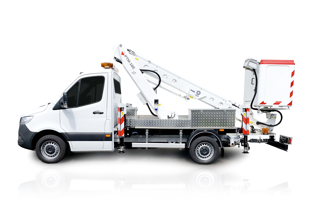 Mercedes Sprinter 319 CDI 4x4 z silnikiem 150 KM i manualną lub automatyczną skrzynią biegów zapewnia mobilność w trudnym terenie. Napęd 4x2 dla kabiny 1+2 lub 4x4 dla kabiny 1+1 dostosowany do specyficznych wymagań operacyjnych i składu załogi. Rozstaw osi 3665 mm gwarantuje stabilność podczas pracy z 16-metrowym podnośnikiem przy zachowaniu kategorii 3,5 tony.