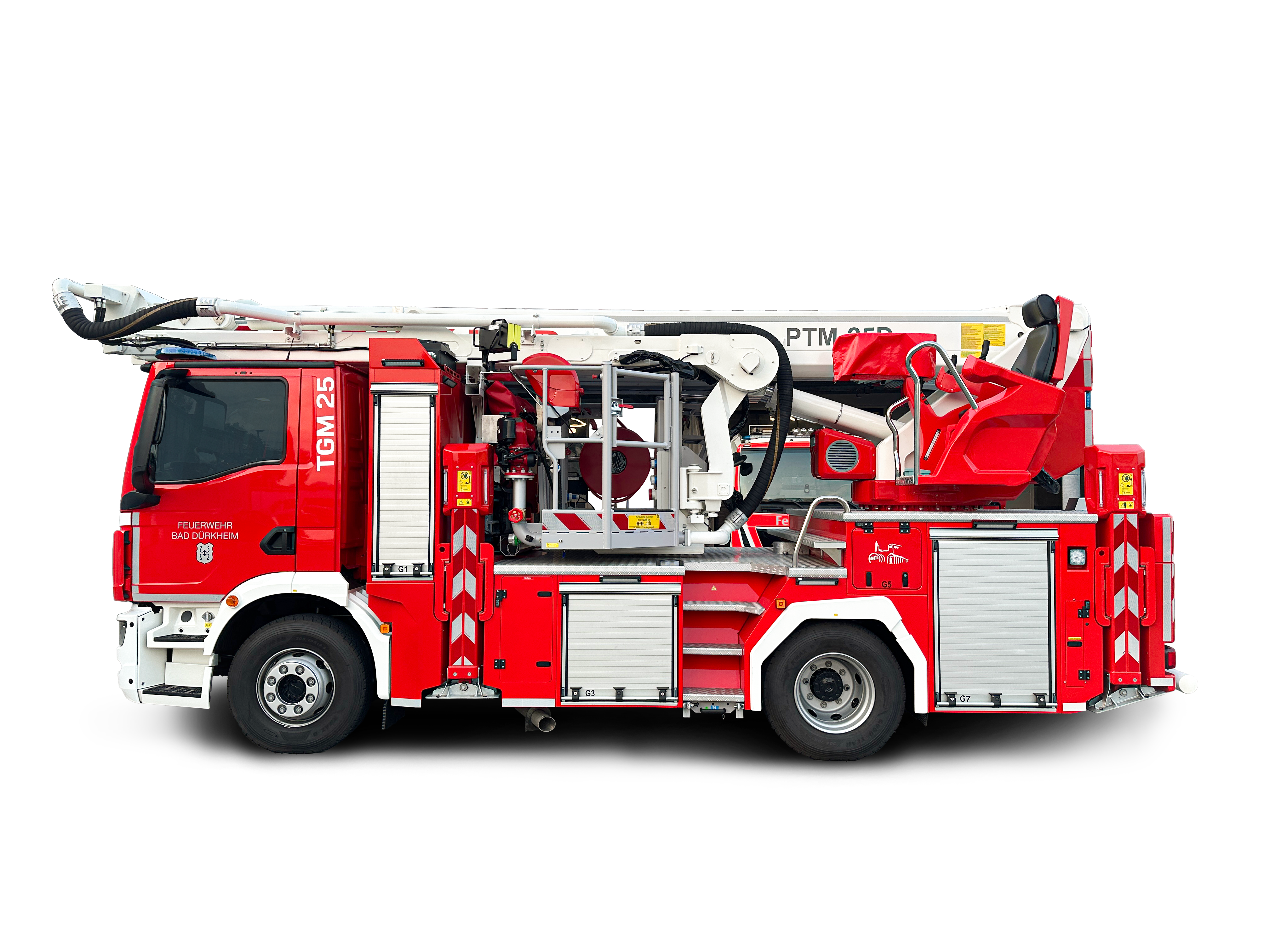 3-członowy wysięgnik główny z długim 4,6m wysięgnikiem manewrowym ze stali wysokowytrzymałej osiąga 25m wysokości roboczej. Drabina ratownicza aluminiowa (3 przęsła główne + 1 manewrowe) z funkcją automatycznego pokrycia szczebli. Zmienny wysięg boczny: 14m dla 135kg, 13m dla 270kg, 12,5m dla 400kg oraz możliwość pracy 3m poniżej gruntu.