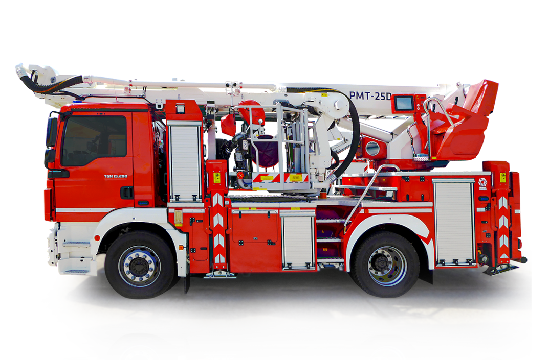 Wysięgnik teleskopowy z wysięgnikiem manewrowym osiąga 25m wysokości roboczej i 23m wysokości ratowniczej. Maksymalny wysięg poziomy 14m dla obciążenia 135kg z precyzyjnym pozycjonowaniem. Aluminiowy kosz udźwignie 400kg z odchylaną kładką ewakuacyjną i systemem mocowania noszy ratowniczych.