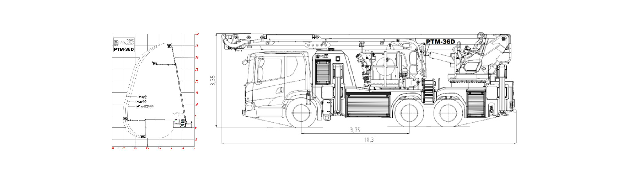 3-elementowy wysięgnik teleskopowy z wysięgnikiem manewrowym osiąga 36m wysokości roboczej i 34m ratowniczej. Maksymalny wysięg poziomy 25m dla obciążenia 135kg umożliwia dostęp do bardzo odległych punktów na dużych wysokościach. Cztery podpory z rozstawem od 2550mm do 6200mm z dwoma stanowiskami sterowania po lewej i prawej stronie pojazdu.